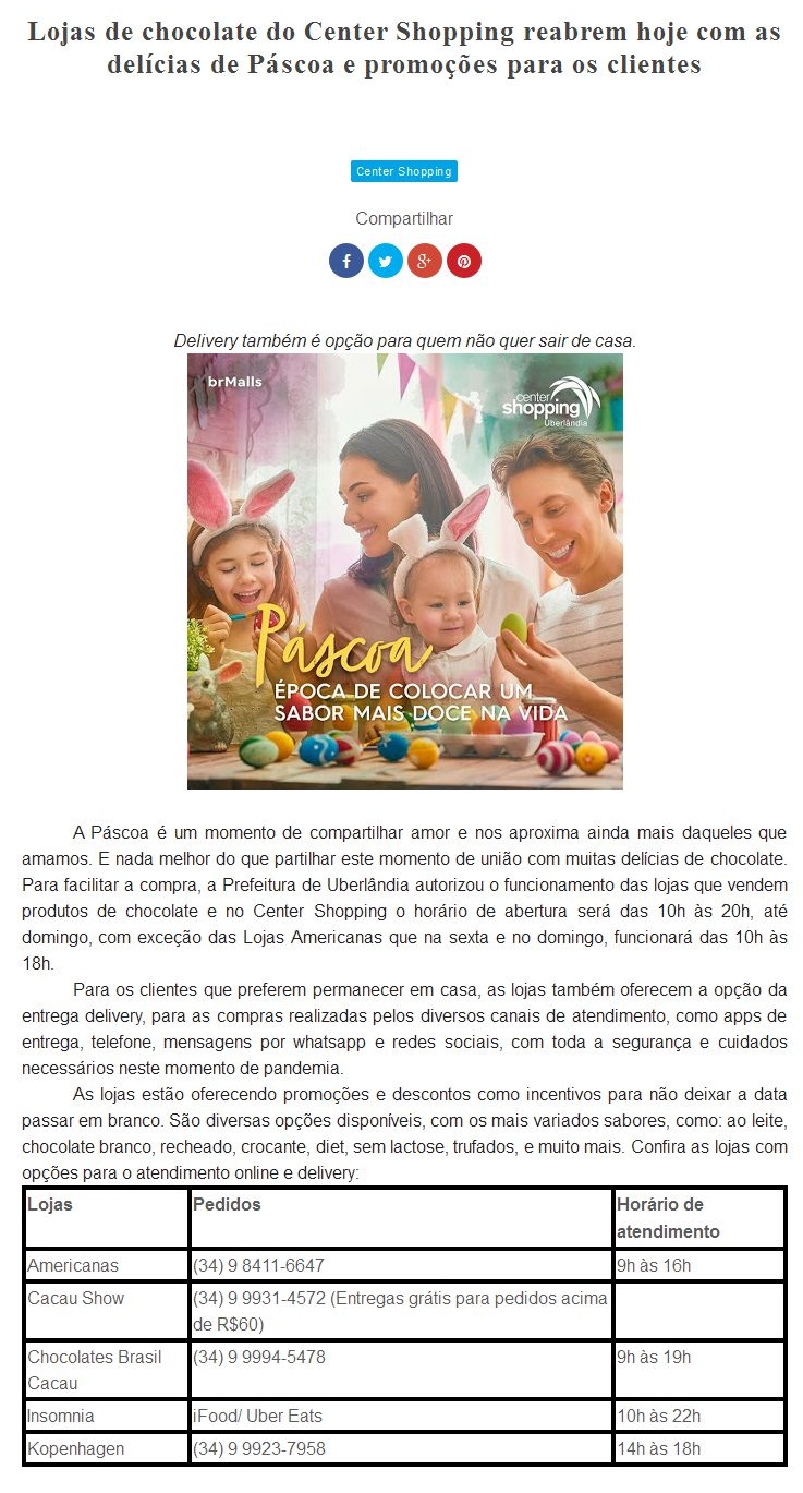 ONLINE - Lojas de chocolate do Center Shopping reabrem hoje com as delícias de Páscoa e promoções para os clientes - 07/04