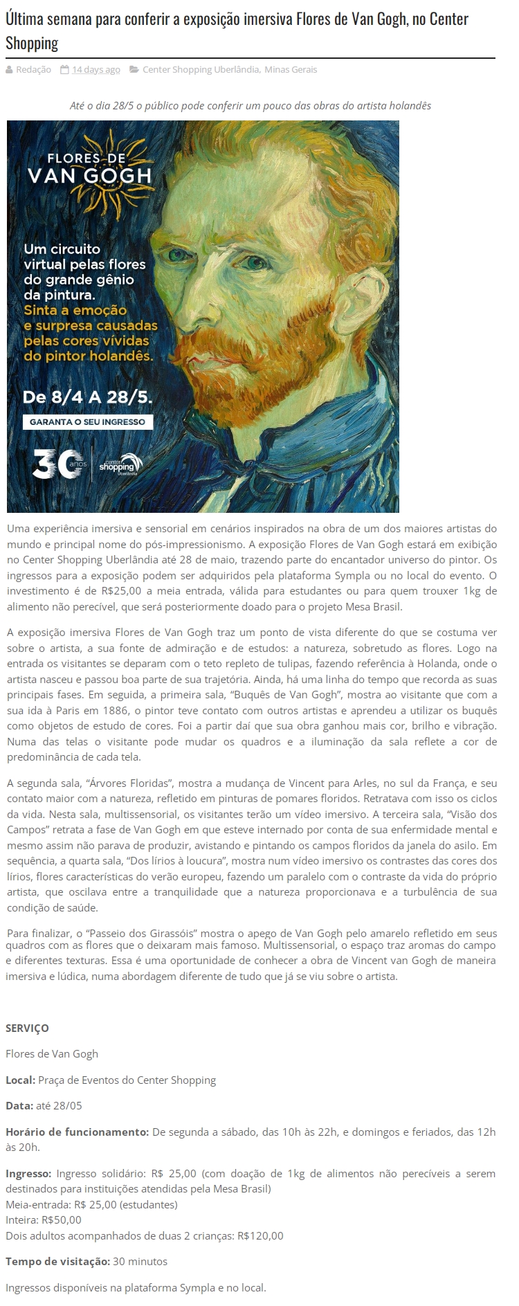 ONLINE - Última semana para conferir a exposição imersiva Flores de Van Gogh, no Center Shopping - 23.05