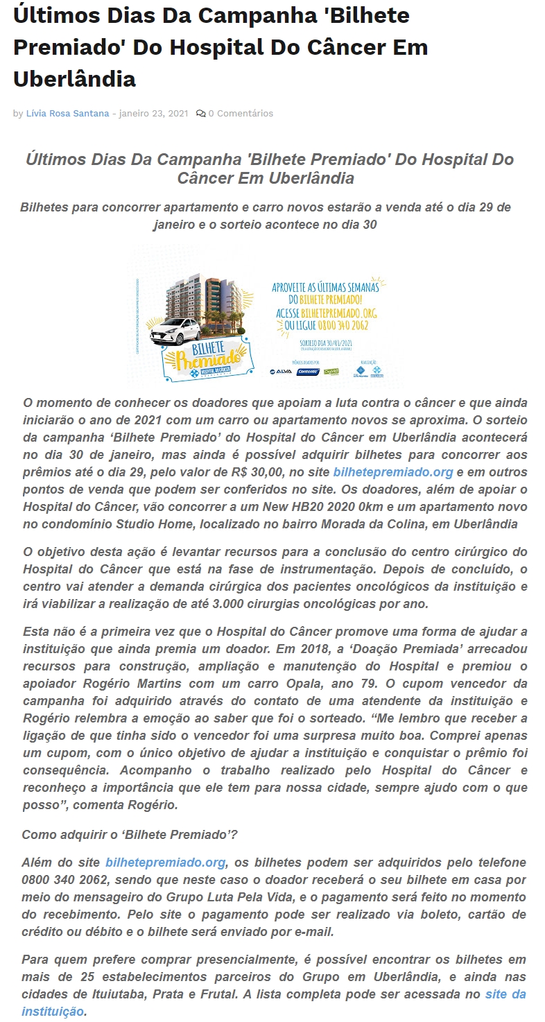 ONLINE - Últimos dias da campanha 'Bilhete Premiado' do Hospital do Câncer em Uberlândia - 23/01
