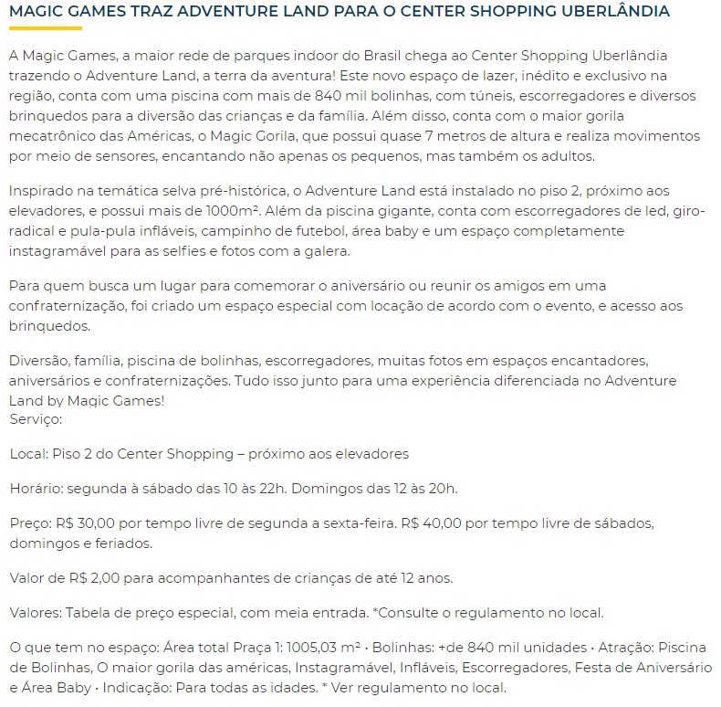 ONLINE - MAGIC GAMES TRAZ ADVENTURE LAND PARA O CENTER SHOPPING UBERLÂNDIA (20/09)