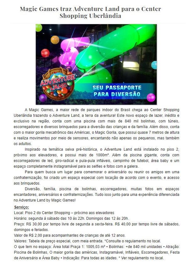 ONLINE - Magic Games traz Adventure Land para o Center Shopping Uberlândia - Magic Games - (20/09)