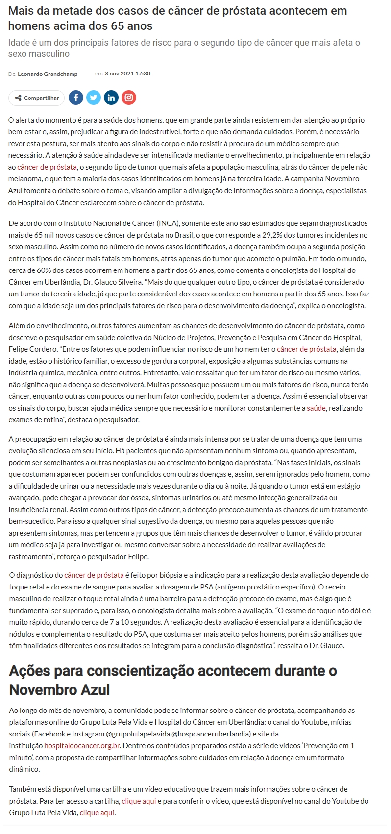 ONLINE - Mais da metade dos casos de câncer de próstata acontecem em homens acima dos 65 anos - 08.11