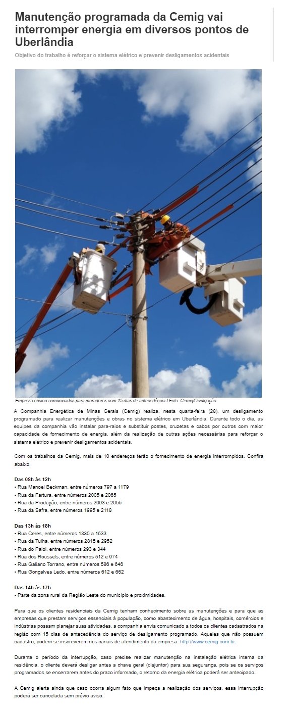 ONLINE - Manutenção programada da Cemig vai interromper energia em diversos pontos de Uberlândia - 28.08