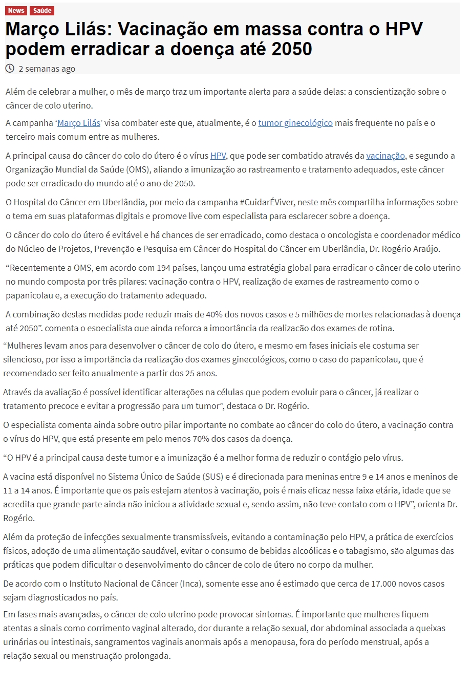 ONLINE - Março Lilás: Vírus do HPV está presente em pelo menos 70% dos casos de câncer de colo uterino - 17.03