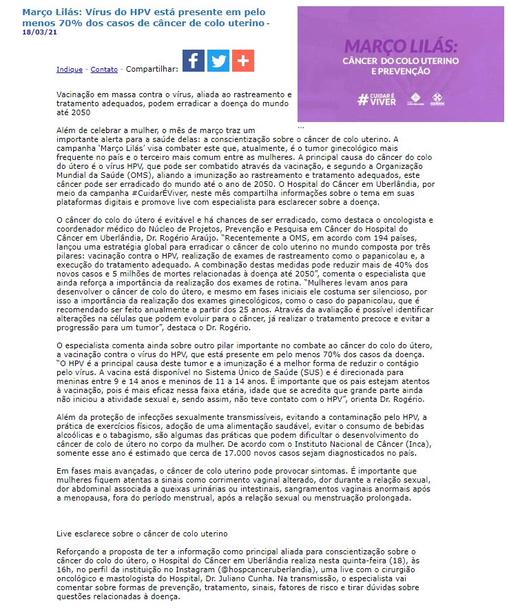 ONLINE - Março Lilás: Vírus do HPV está presente em pelo menos 70% dos casos de câncer de colo uterino - 18.03