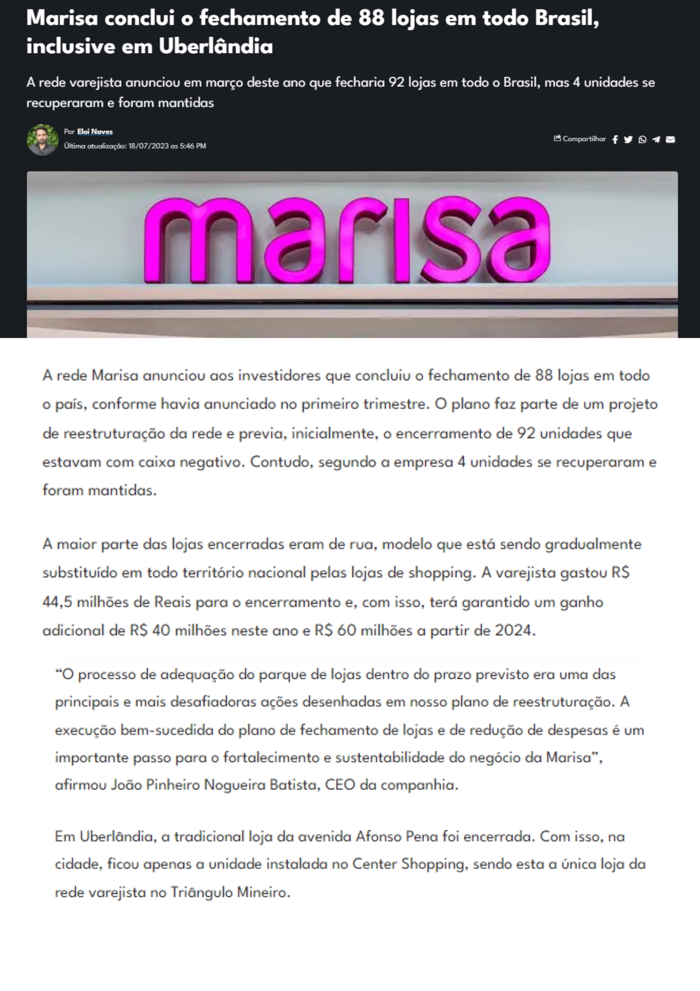 ONLINE - Marisa conclui o fechamento de 88 lojas em todo Brasil, inclusive em Uberlāndia - 18.07