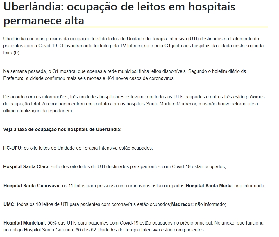 ONLINE - Matéria sobre a taxa de ocupação de leitos em hospitais de Uberlândia - Menção ao UMC - 09.02