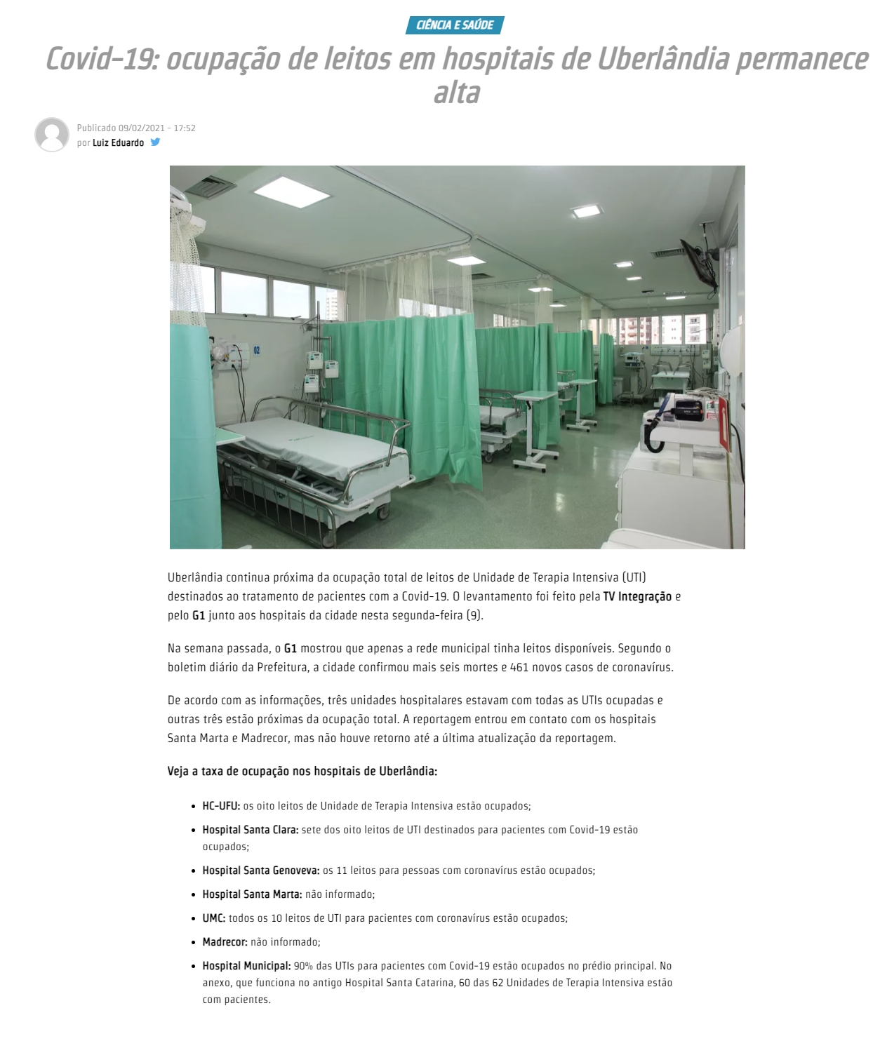 ONLINE - Matéria sobre a taxa de ocupação dos leitos em hospitais de Uberlândia - Menção aos leitos do UMC - 09.02