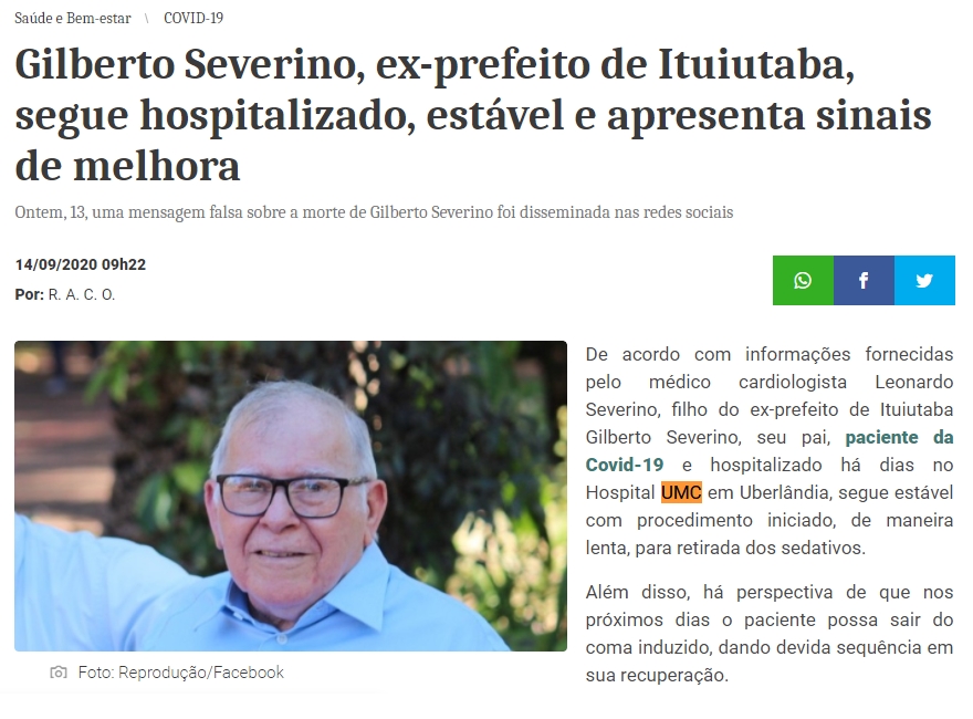 ONLINE - Menção ao hospital com a internação de Gilberto Severino, ex-prefeito de Ituiutaba - 14.09