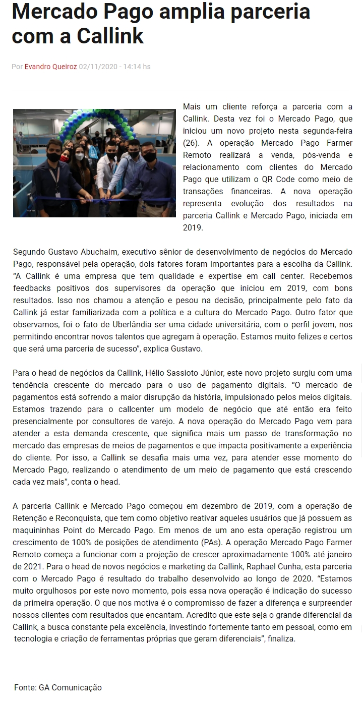 ONLINE - Mercado Pago amplia parceria com a Callink - 02/11