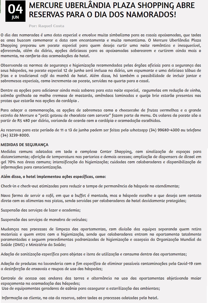 ONLINE -Mercure Uberlāndia Plaza Shopping abre reservas para o dia dos namorados - (04/06)
