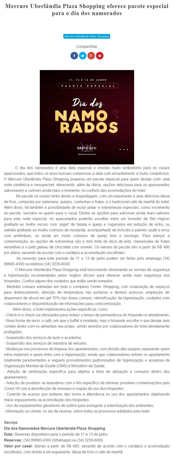 ONLINE - Mercure Uberlândia Plaza Shopping oferece pacote especial para o dia dos namorados - 05/06