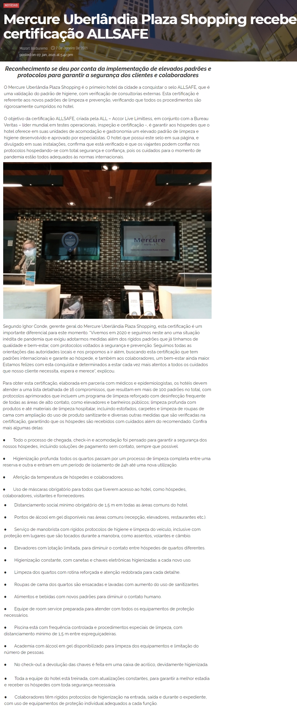ONLINE - Mercure Uberlândia Plaza Shopping recebe certificação ALLSAFE - 07/01