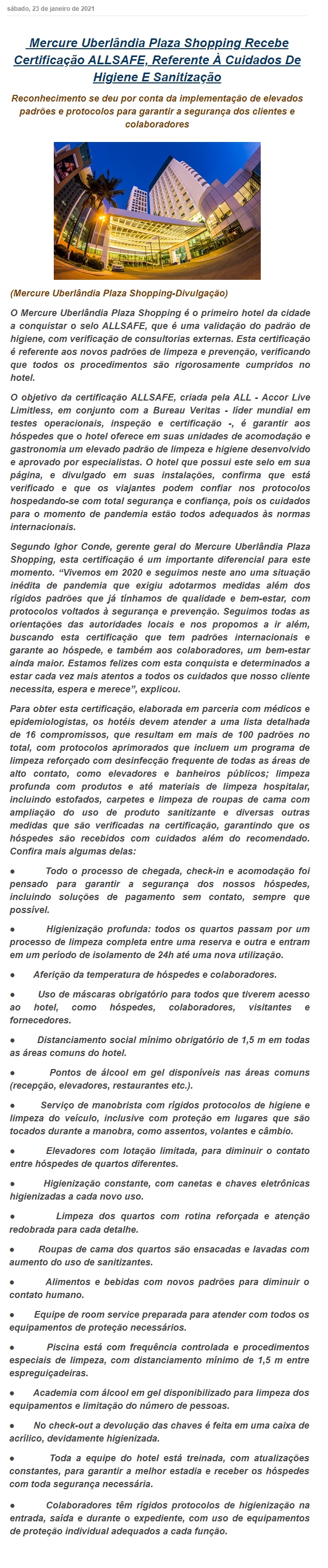 ONLINE - Mercure Uberlândia Plaza Shopping recebe certificação ALLSAFE, referente à cuidados de higiene e sanitização - 23/01