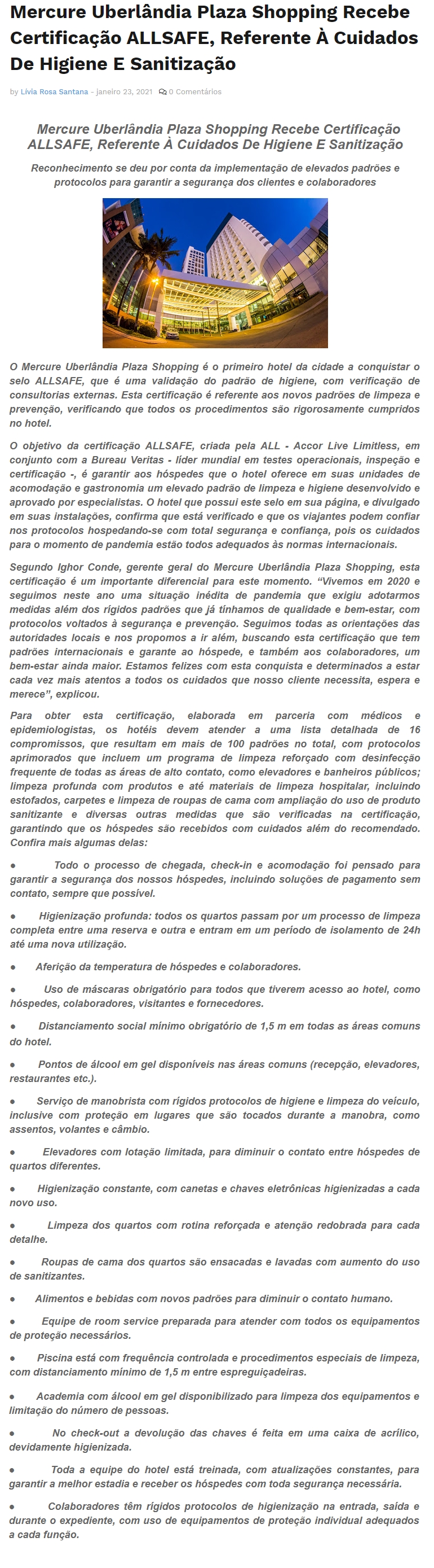 ONLINE - Mercure Uberlândia Plaza Shopping recebe certificação ALLSAFE, referente à cuidados de higiene e sanitização - 23/01