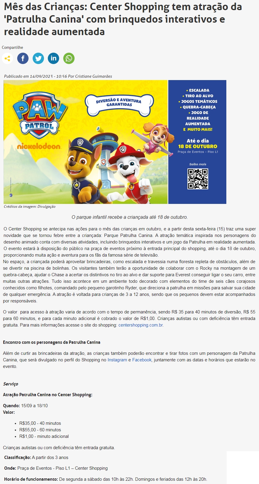 ONLINE-Mês das Crianças: Center Shopping tem atração da 'Patrulha Canina' com brinquedos interativos e realidade aumentada-14.09