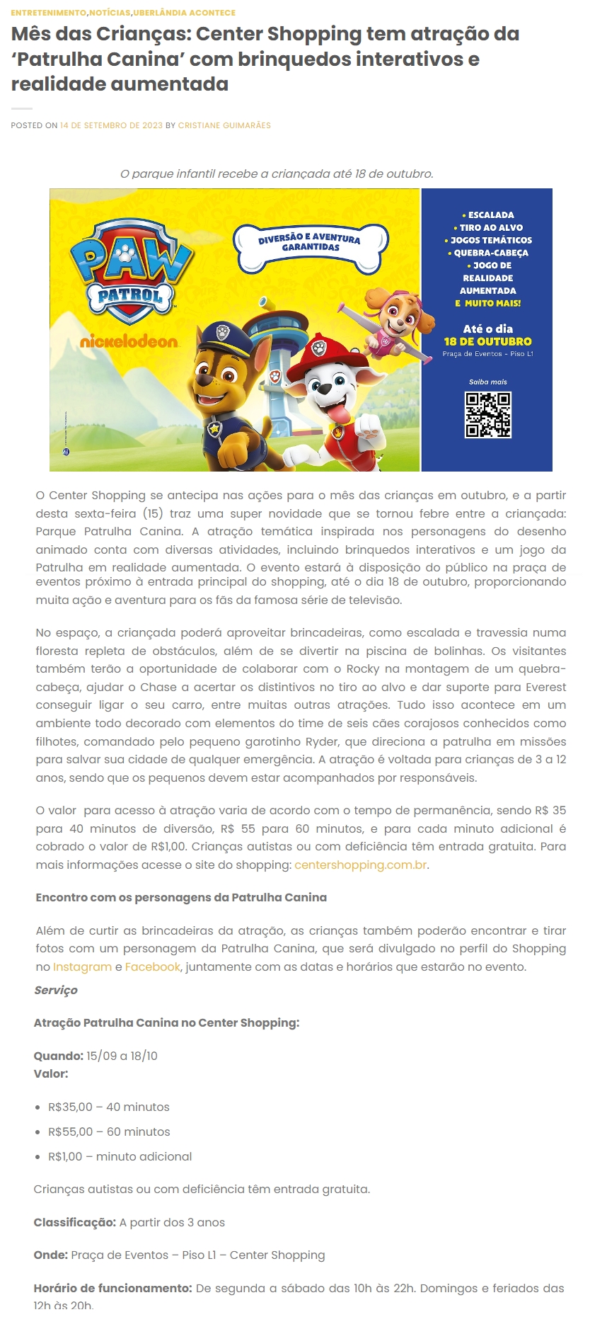 ONLINE-Mês das Crianças: Center Shopping tem atração da 'Patrulha Canina' com brinquedos interativos e realidade aumentada-14.09