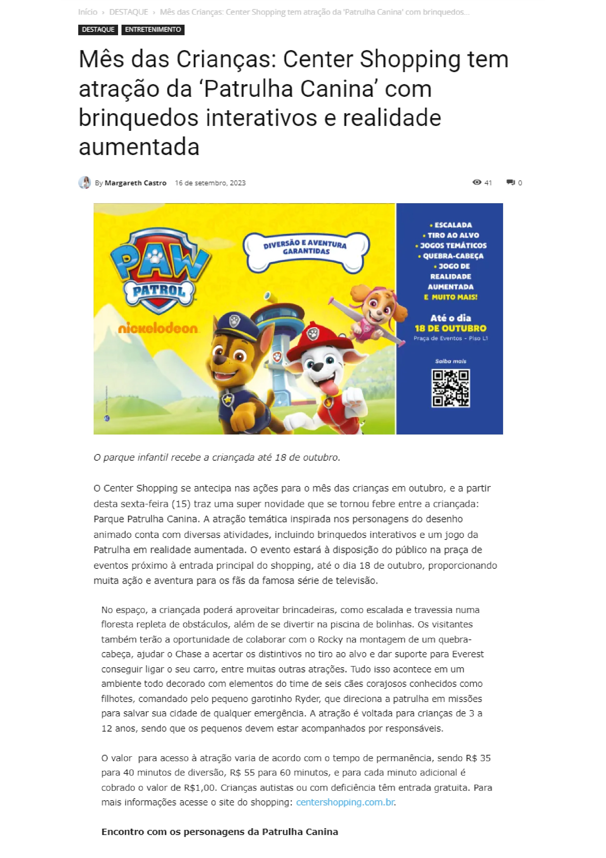 ONLINE - Mês das Crianças: Center Shopping tem atração da 'Patrulha Canina' com brinquedos interativos e realidade aumentada - 16.09