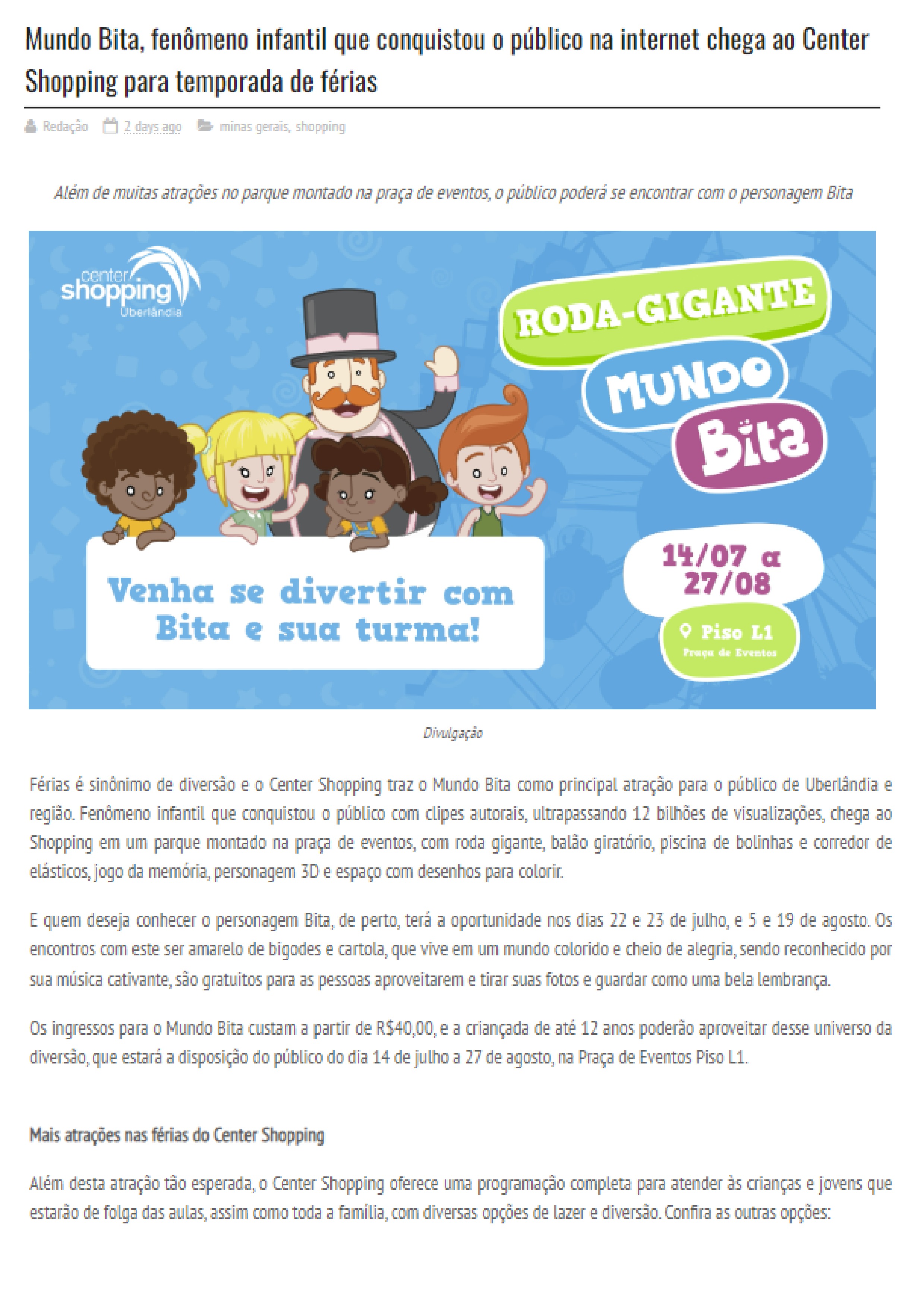 ONLINE - Mundo Bita, fenômeno infantil que conquistou o público na internet chega ao Center Shopping para temporada de férias - 10.07
