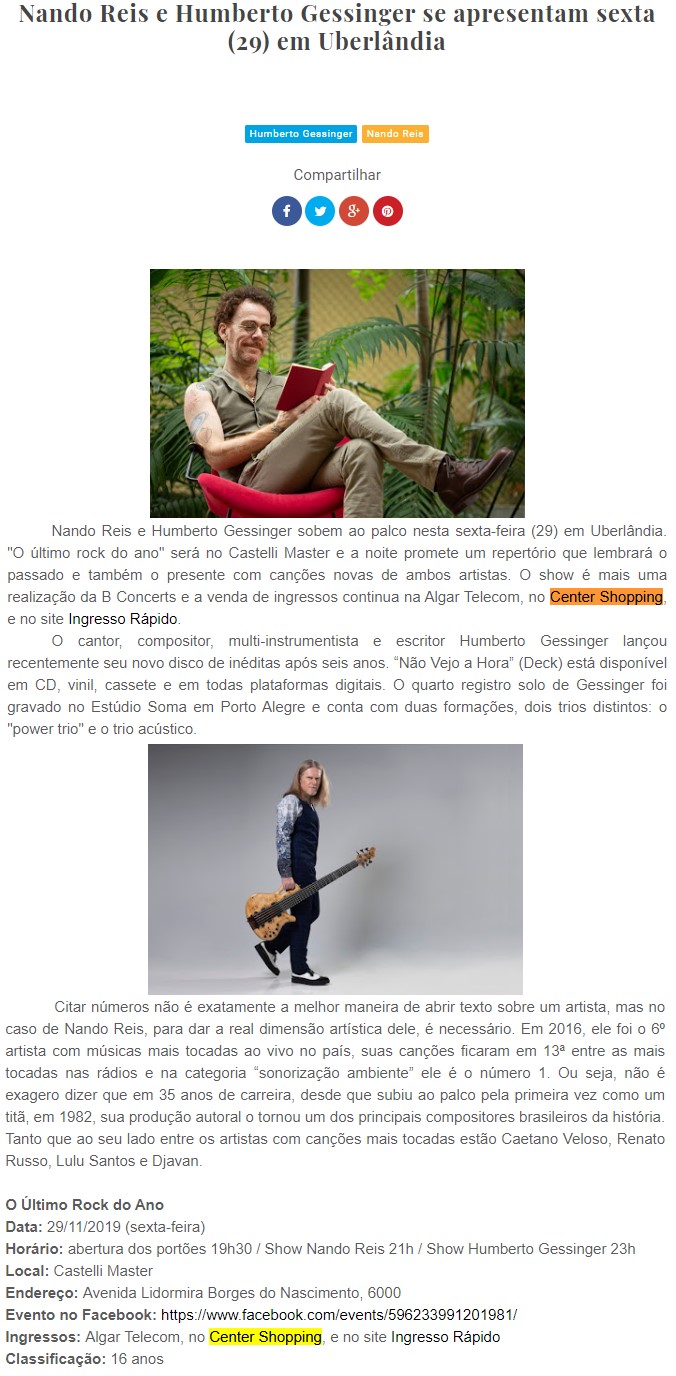 ONLINE - Nando Reis e Humberto Gessinger se apresentam sexta (29) em Uberlândia - PONTO DE VENDAS (28/11)