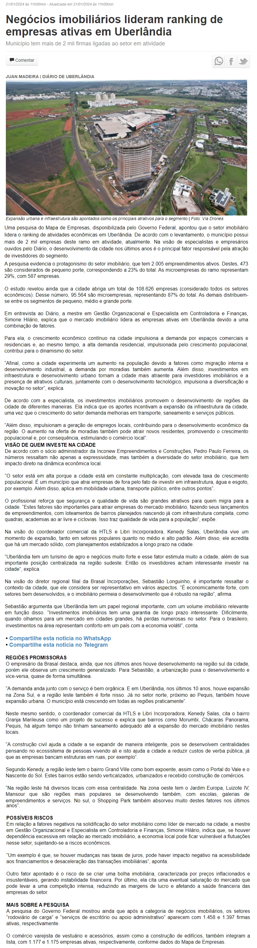 ONLINE - Negócios imobiliários lideram ranking de empresas ativas em Uberlândia- 21.01