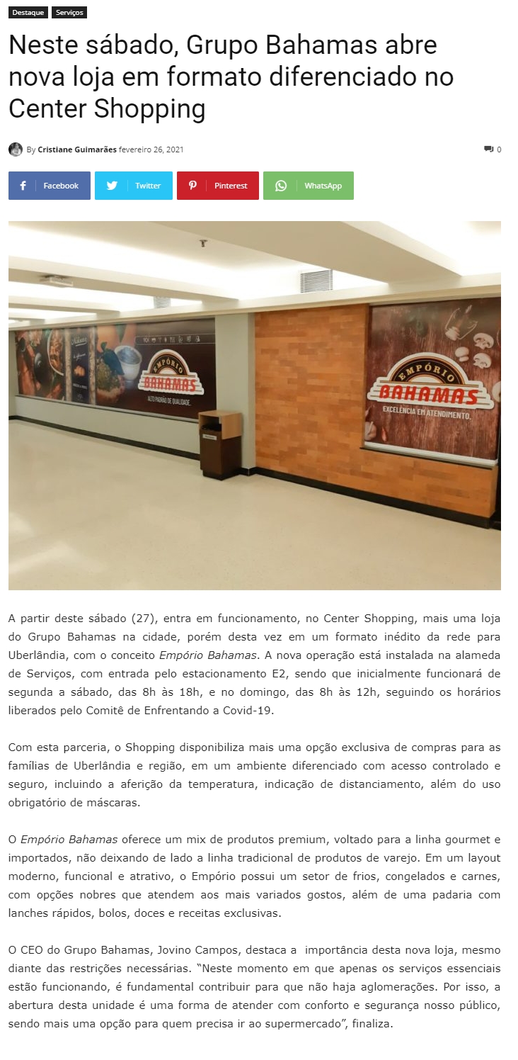 ONLINE - Neste sábado, Grupo Bahamas abre nova loja em formato diferenciado no Center Shopping - 26.02