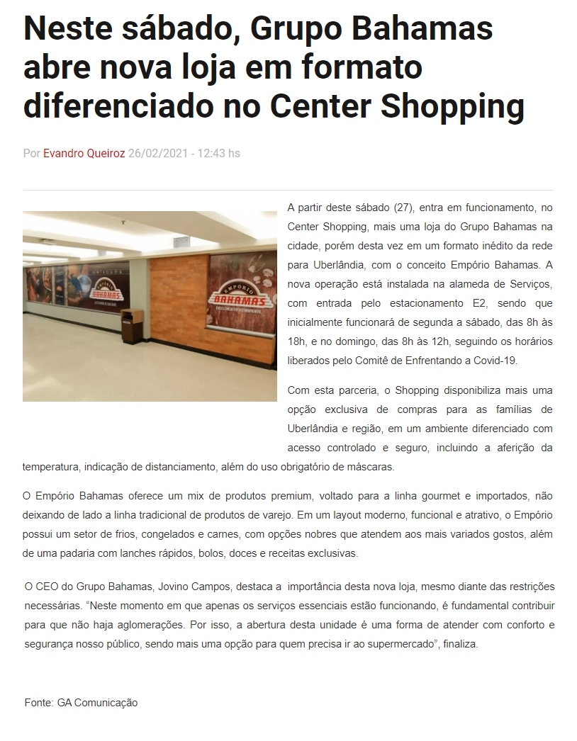 ONLINE - Neste sábado, Grupo Bahamas abre nova loja em formato diferenciado no Center Shopping - 26.02