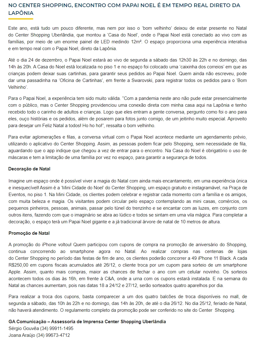 ONLINE - No Center Shopping, encontro com Papai Noel é em tempo real direto da Lapônia - 10/12