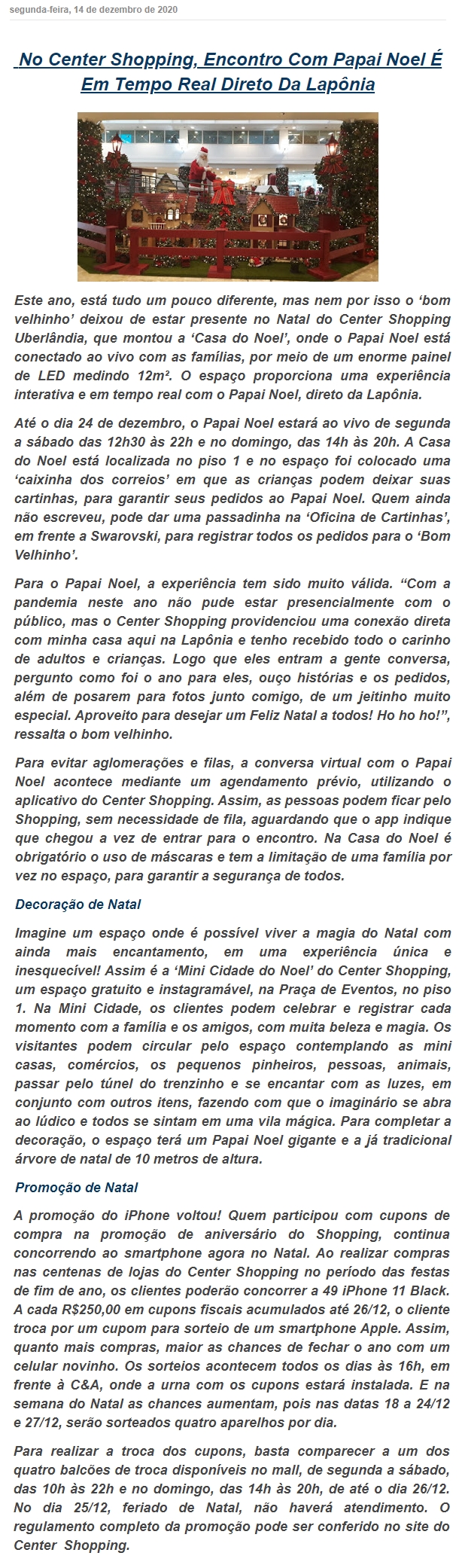 ONLINE - No Center Shopping, encontro com Papai Noel é em tempo real direto da Lapônia - 14/12