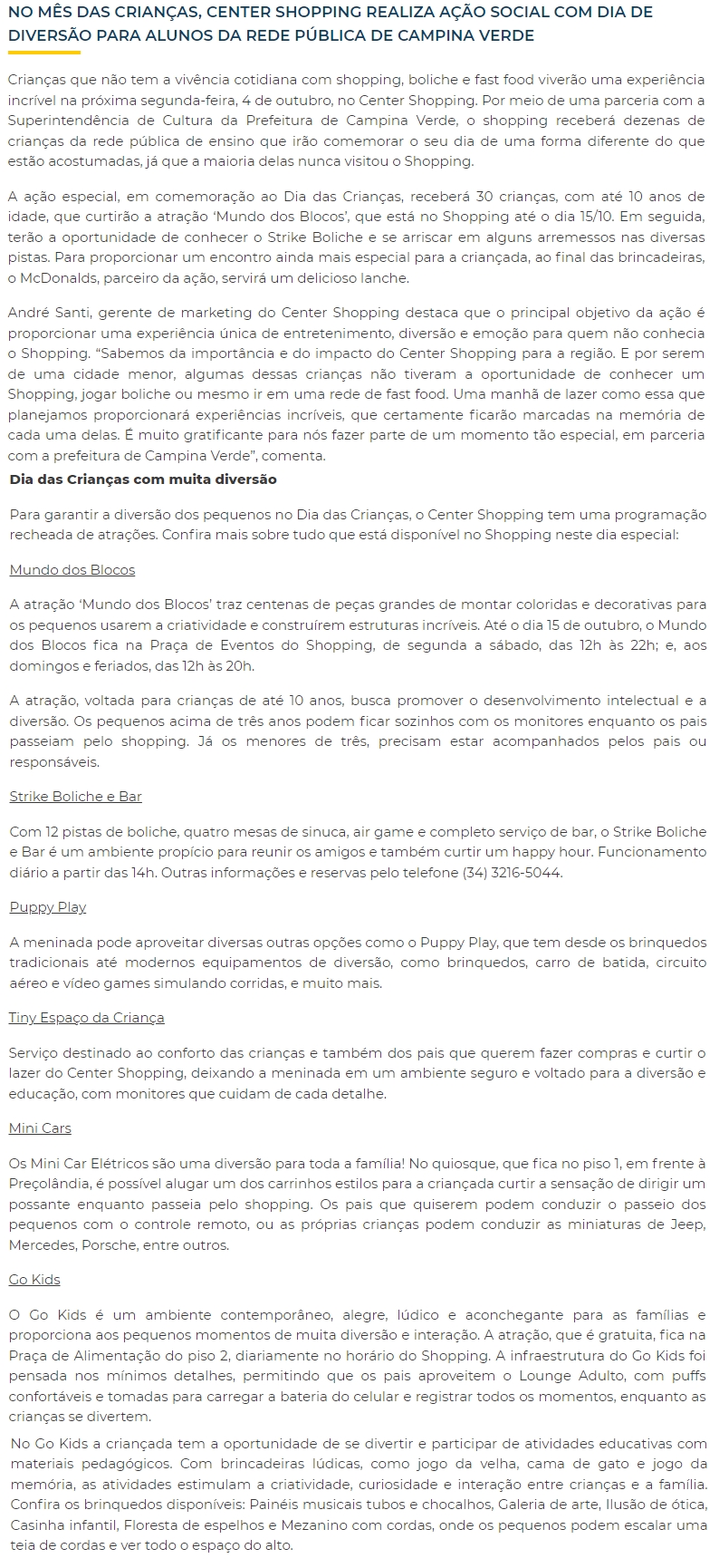 ONLINE-No mês das crianças, Center Shopping realiza ação social com dia de diversão para alunos da rede pública de Campina Verde - 04.10