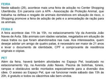 ONLINE - NOTA sobre a feira de adoção de pets no Center Shopping - 26.05