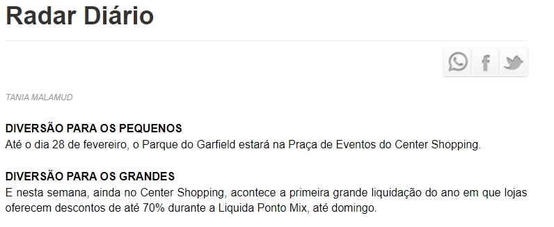 ONLINE - Nota sobre Ponto Mix e Parque do Garfield - 14.01