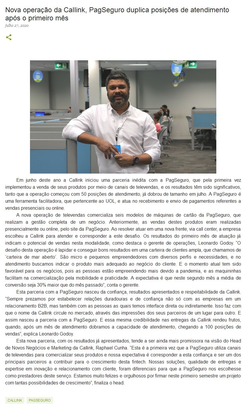 ONLINE - Nova operação da Callink, PagSeguro duplica posições de atendimento após o primeiro mês - 27/07