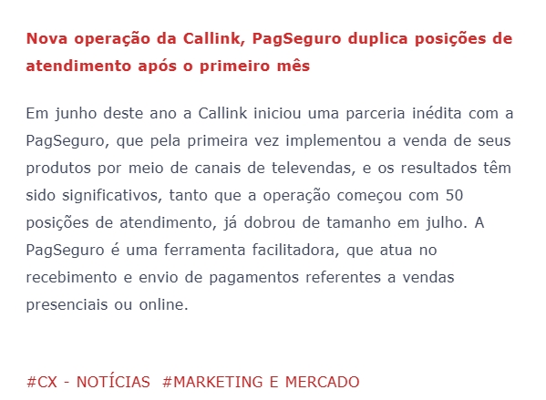 ONLINE - Nova operação da Callink, PagSeguro duplica posições de atendimento após o primeiro mês - (27/07)