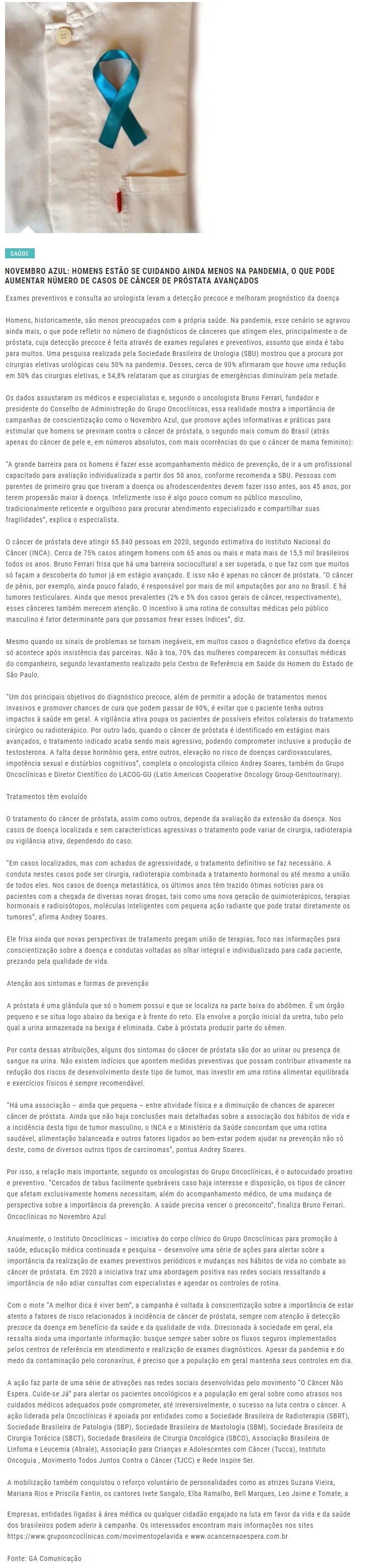 ONLINE - Novembro Azul: homens estão se cuidando ainda menos na pandemia, o que pode aumentar número de casos de câncer de próstata avançados - 12/11