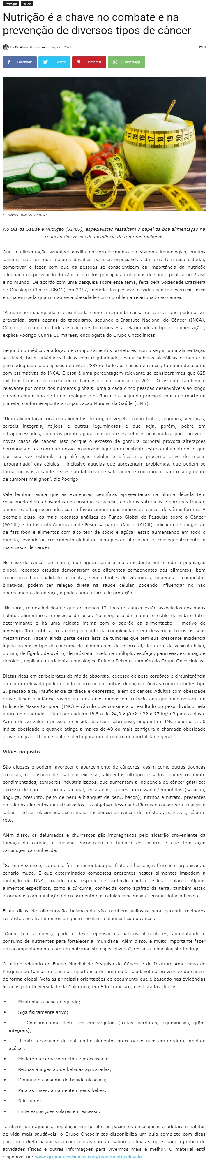 ONLINE - Nutrição é a chave no combate e na prevenção de diversos tipos de câncer - 30.03