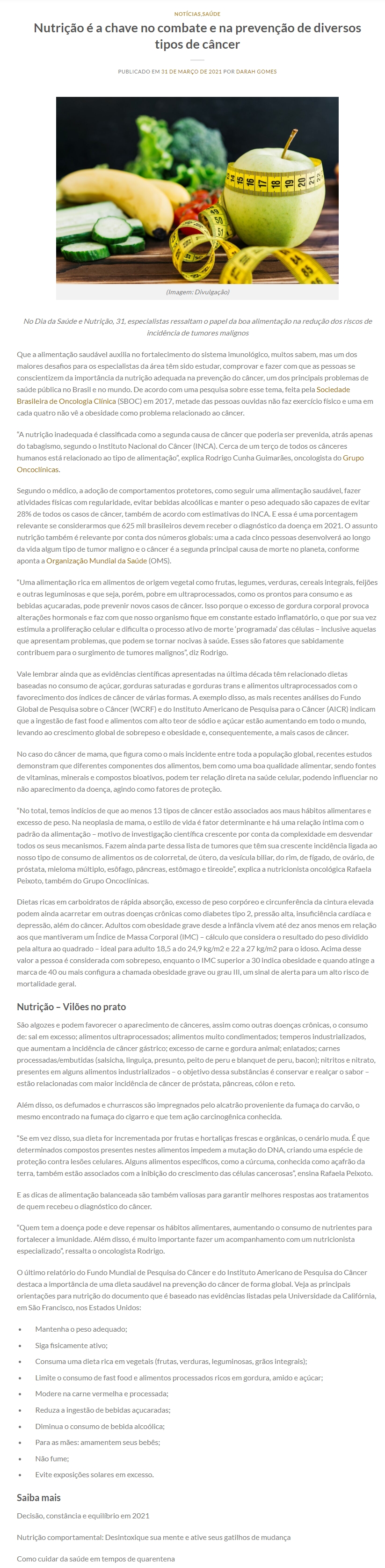 ONLINE - Nutrição é a chave no combate e na prevenção de diversos tipos de câncer - 31.03