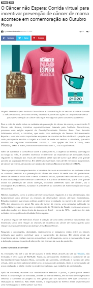 ONLINE - O Câncer não Espera: Corrida virtual para incentivar prevenção de câncer de mama acontece em comemoração ao Outubro Rosa - 20/10