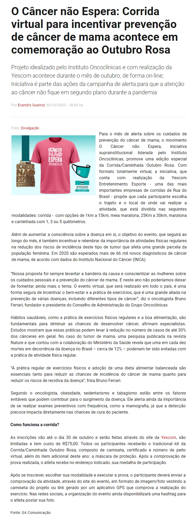 ONLINE - O Câncer não Espera: Corrida virtual para incentivar prevenção de câncer de mama acontece em comemoração ao Outubro Rosa - 20/10