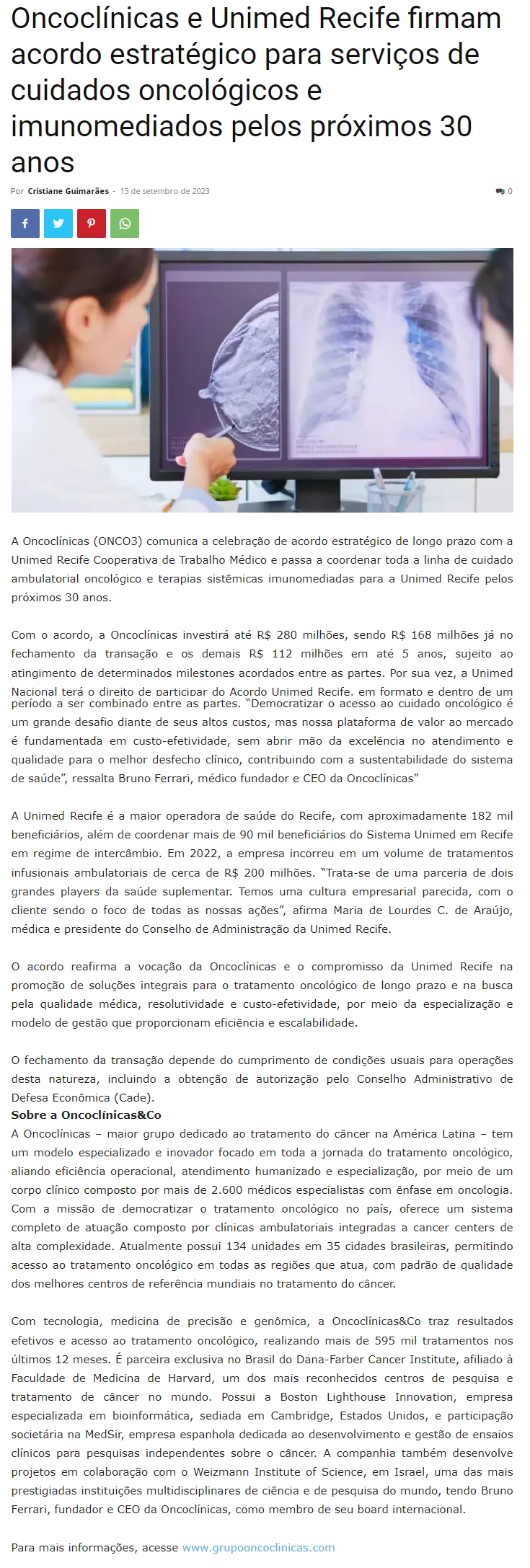 ONLINE - Oncoclínicas e Unimed Recife firmam acordo estratégico para serviços de cuidados oncológicos e imunomediados pelos próximos 30 anos-13.09