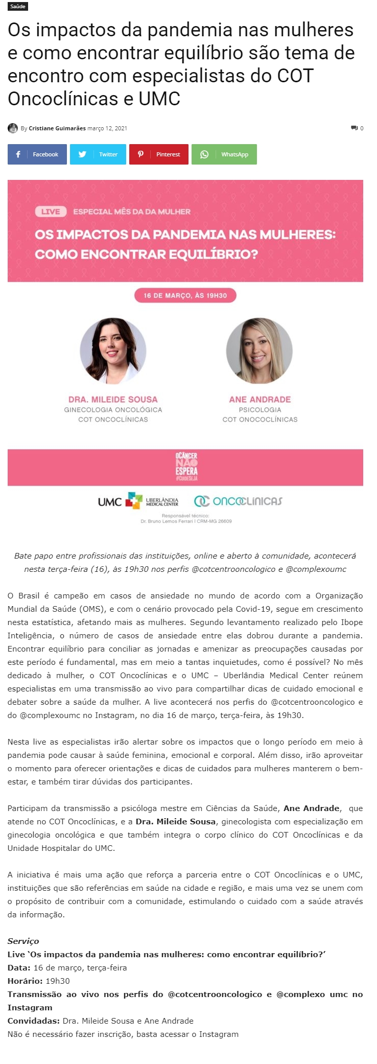 ONLINE - Os impactos da pandemia nas mulheres e como encontrar equilíbrio são tema de encontro com especialistas do COT Oncoclínicas e UMC - 12.03