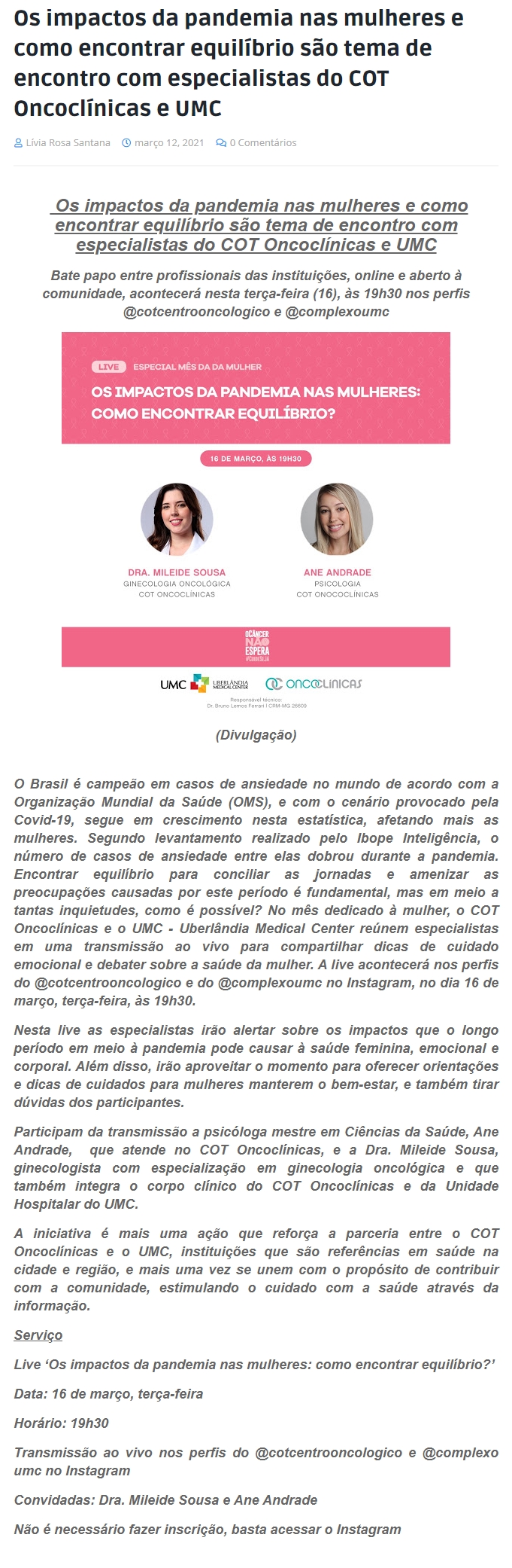 ONLINE - Os impactos da pandemia nas mulheres e como encontrar equilíbrio são tema de encontro com especialistas do COT Oncoclínicas e UMC - 12.03