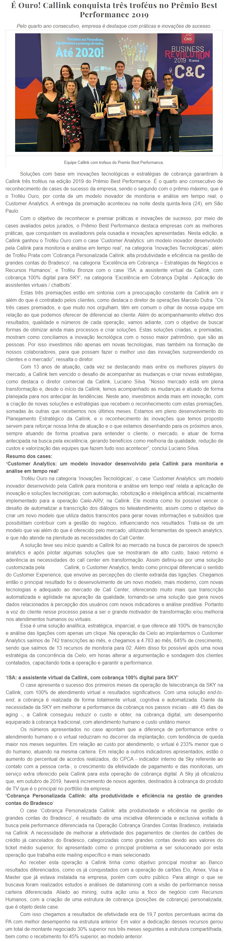 ONLINE - É Ouro! Callink conquista três troféus no Prêmio Best Performance 2019 (31/10)