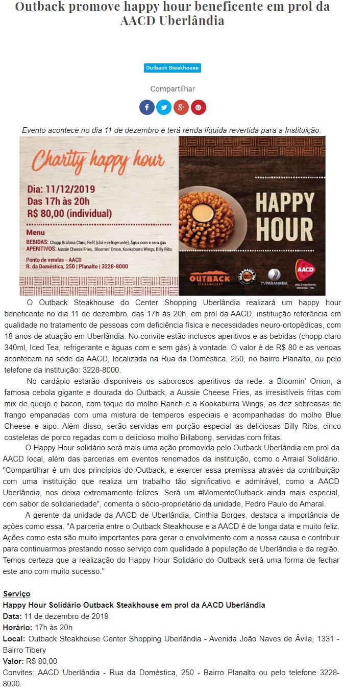 ONLINE - Outback promove happy hour beneficente em prol da AACD Uberlândia (06/12)