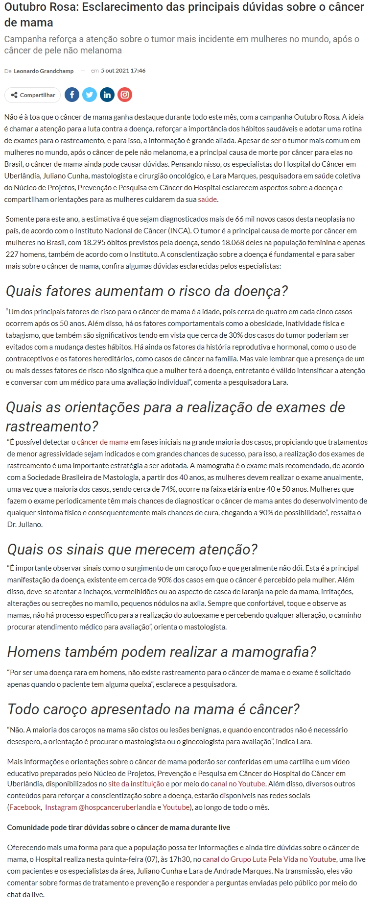 ONLINE- Outubro Rosa: Esclarecimento das principais dúvidas sobre o câncer de mama - 05.10