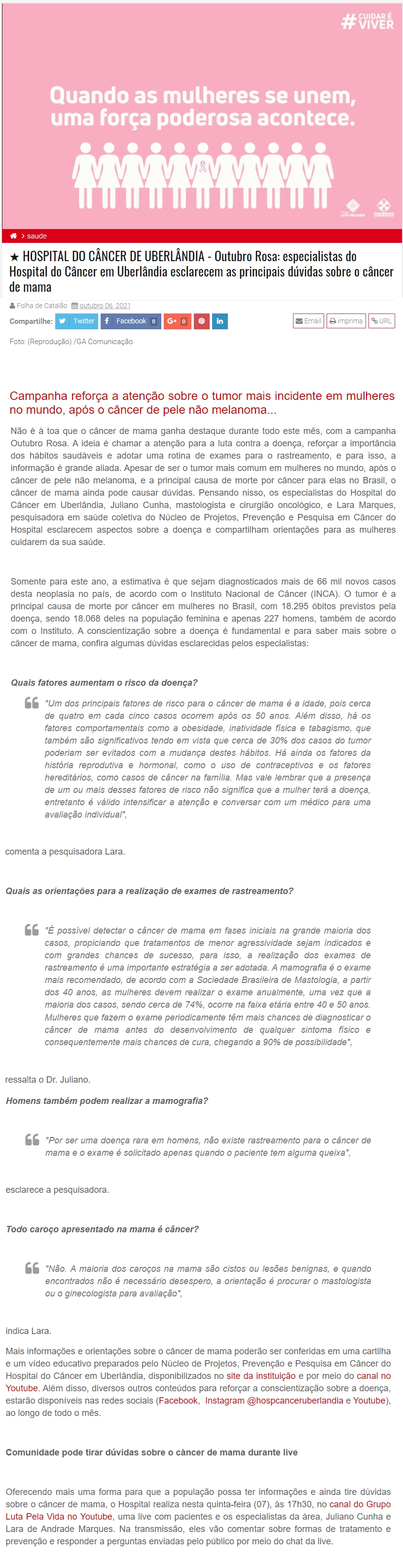 ONLINE-Outubro Rosa: especialistas do Hospital do Câncer em Uberlândia esclarecem as principais dúvidas sobre o câncer de mama - 07.10