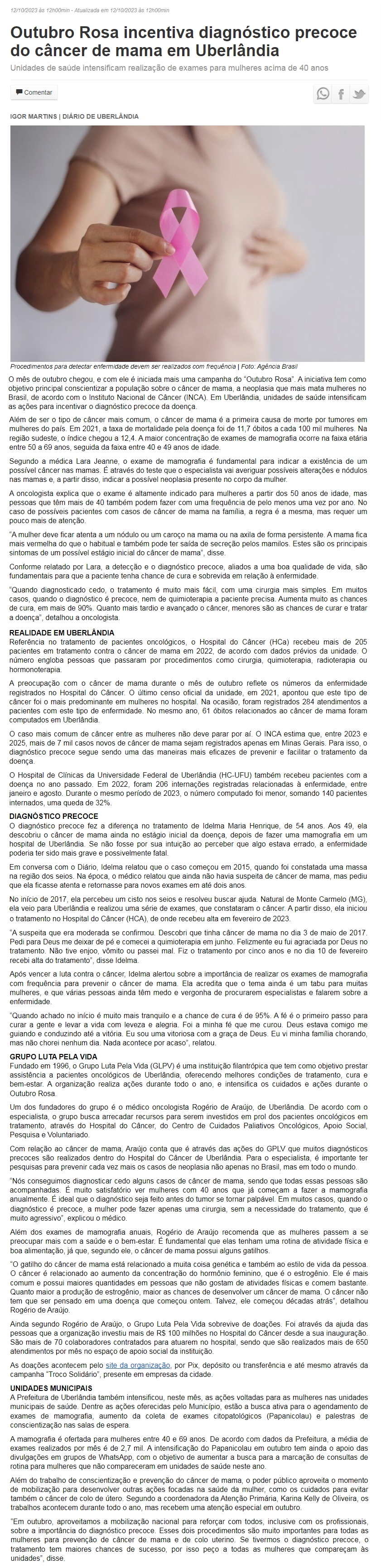 ONLINE - Outubro Rosa incentiva diagnóstico precoce do câncer de mama em Uberlândia - 12.10