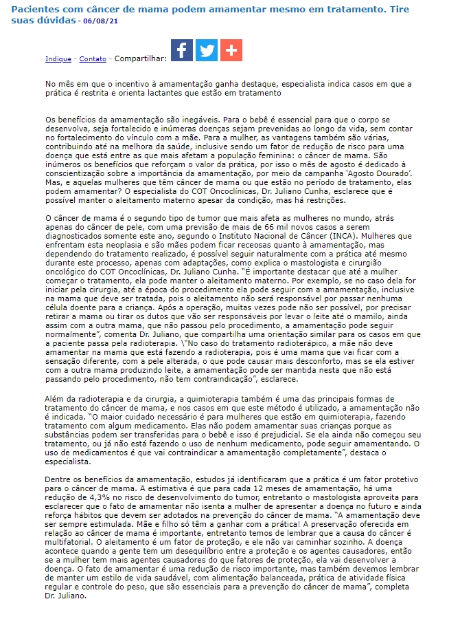 ONLINE - Pacientes com câncer de mama podem amamentar mesmo em tratamento. Tire suas dúvidas - 15.08
