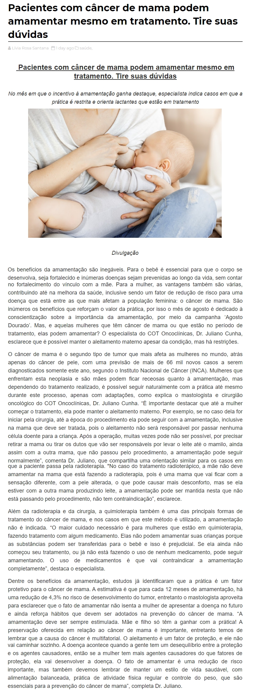 ONLINE - Pacientes com câncer de mama podem amamentar mesmo em tratamento. Tire suas dúvidas - 8.08