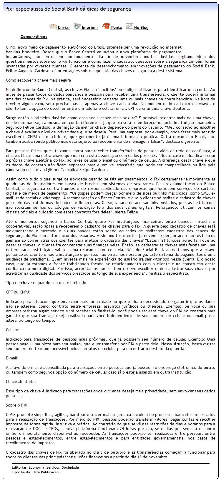 ONLINE - Pix: especialista do Social Bank dá dicas de segurança - 12/11